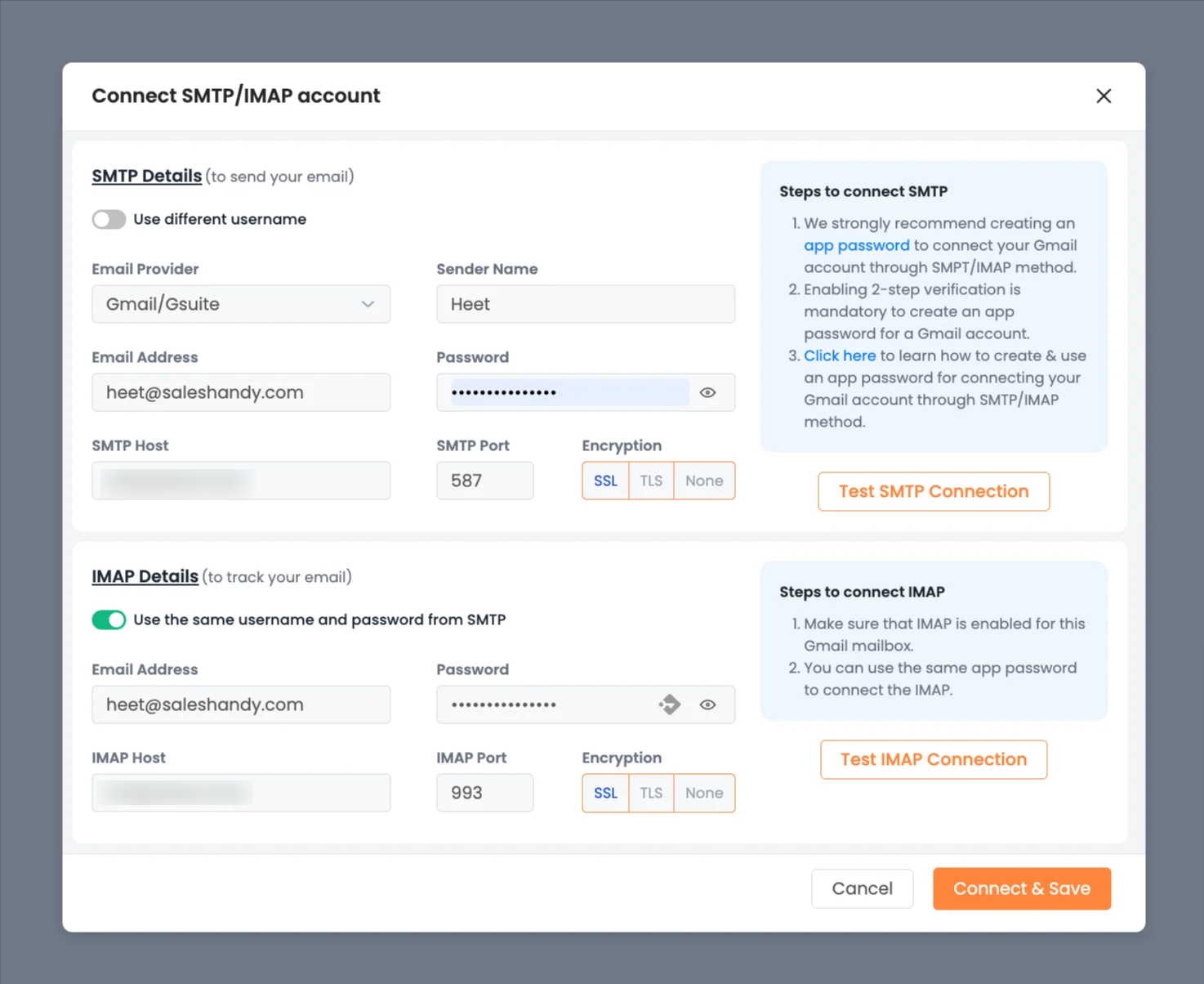 Enter the following SMTP/IMAP details for google: