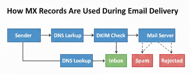 When an email is sent, the sending mail server performs a DNS lookup on the recipient’s domain.