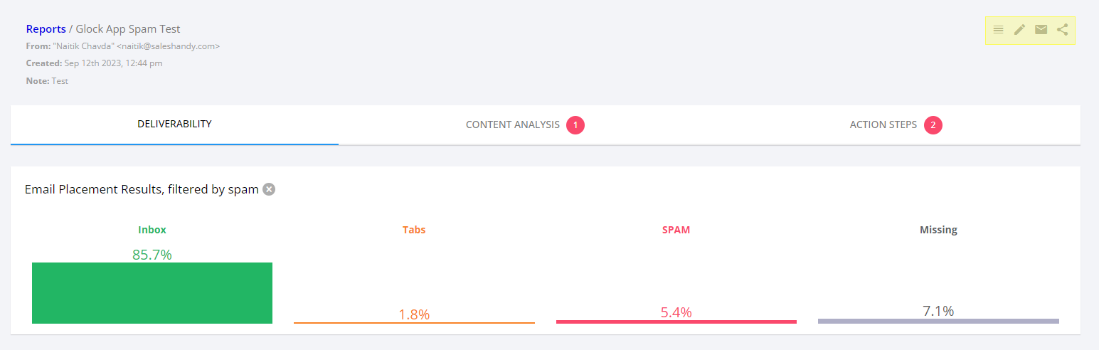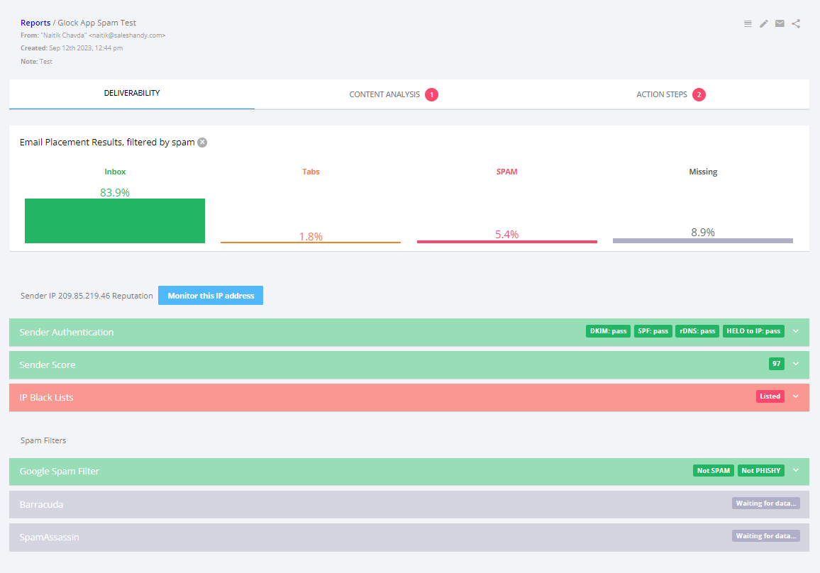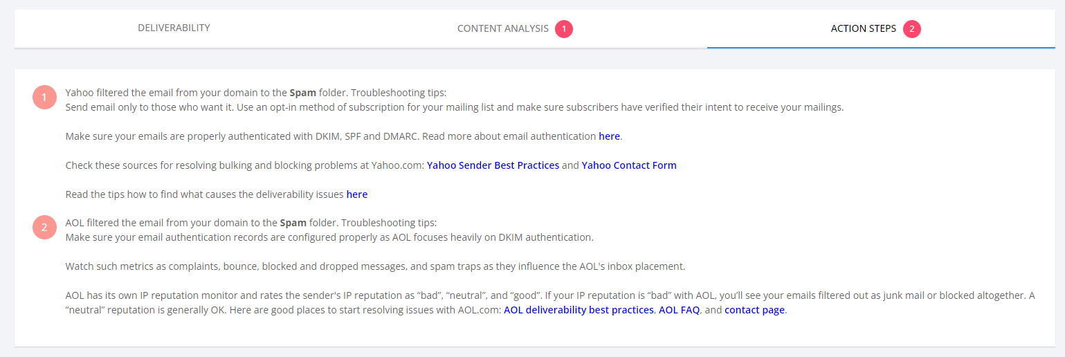 GlockApps will also recommend improving your test results under the Action Steps tab. We recommend you read them and take the suggested steps to improve your email deliverability.
