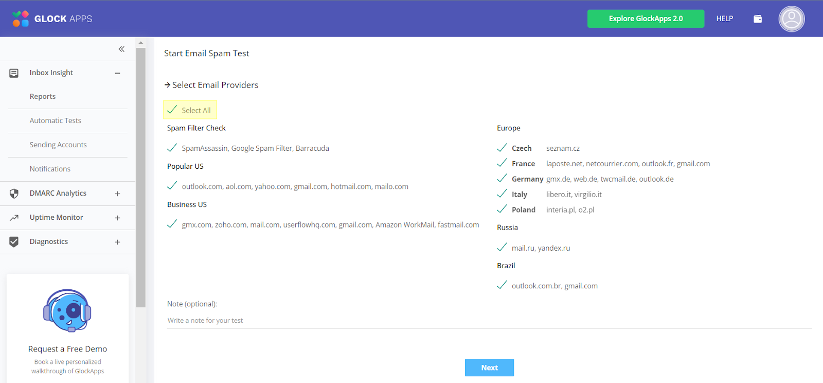 We recommend selecting all the available providers and spam filters so that you get a thorough insight into your email deliverability.