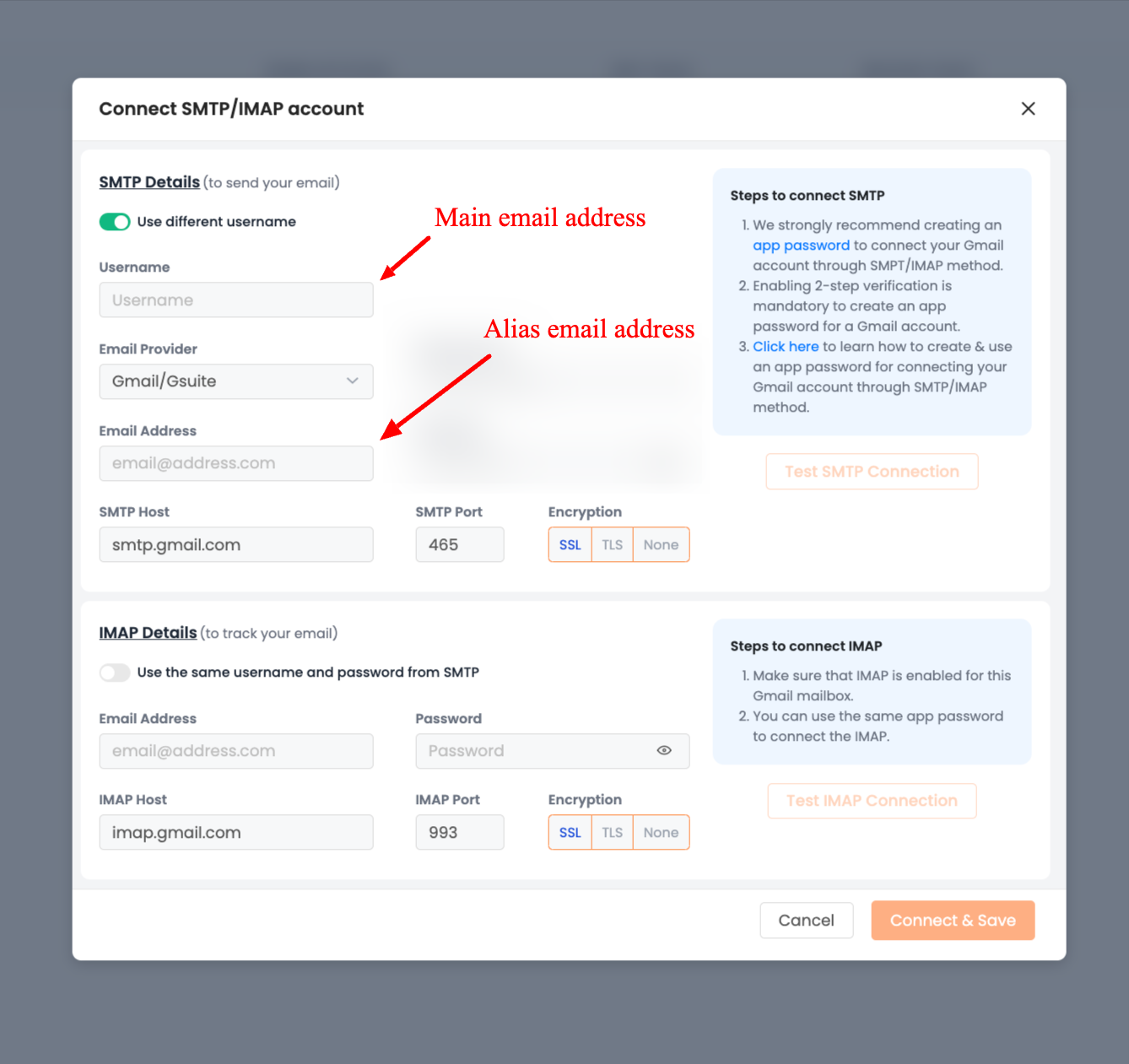 🚨Important: Select your email provider and enable the "Use different username" toggle. This will let you specify an alias for sending emails.