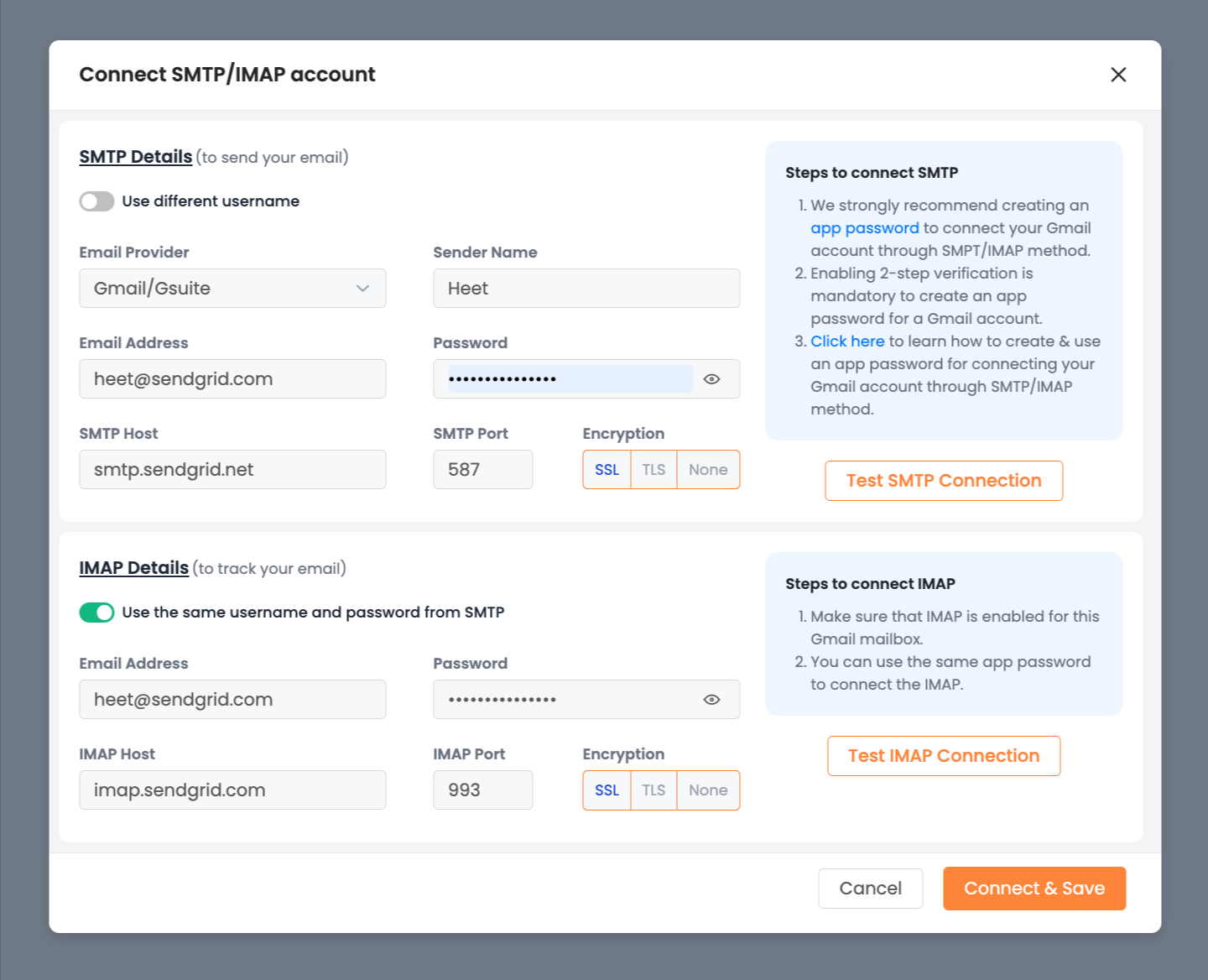You'll need to enter the following SMTP/IMAP details for SendGrid:
