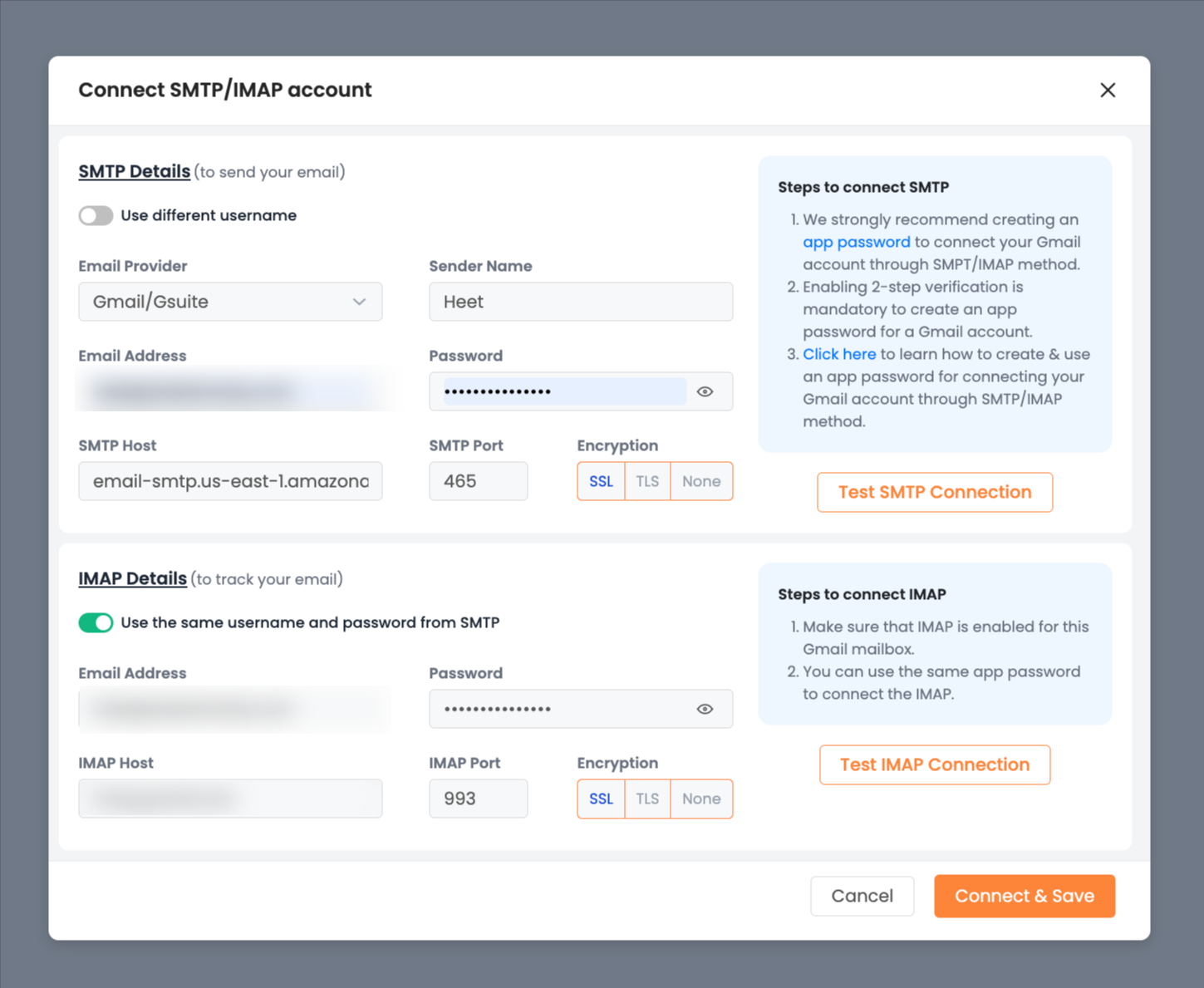 Enter the following SMTP/IMAP details for Amazon SES: