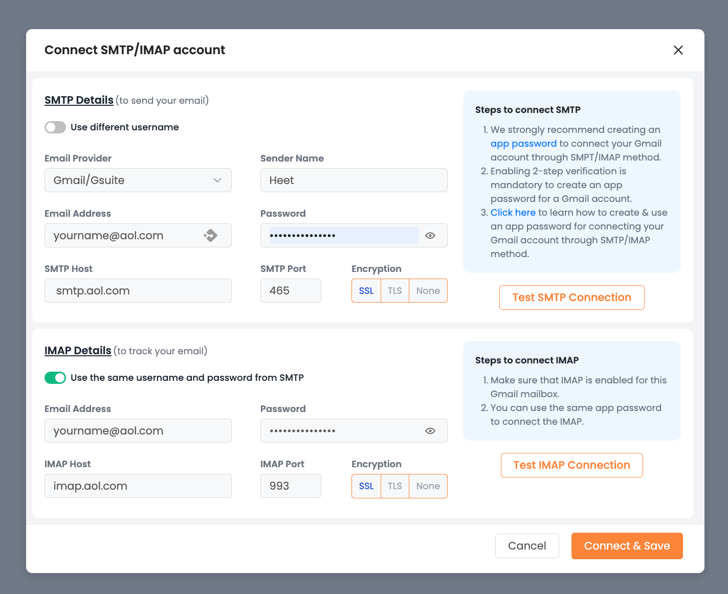 Validate all the details you have entered in TrulyInbox. Once you're all set, click "Connect" and then "Save."