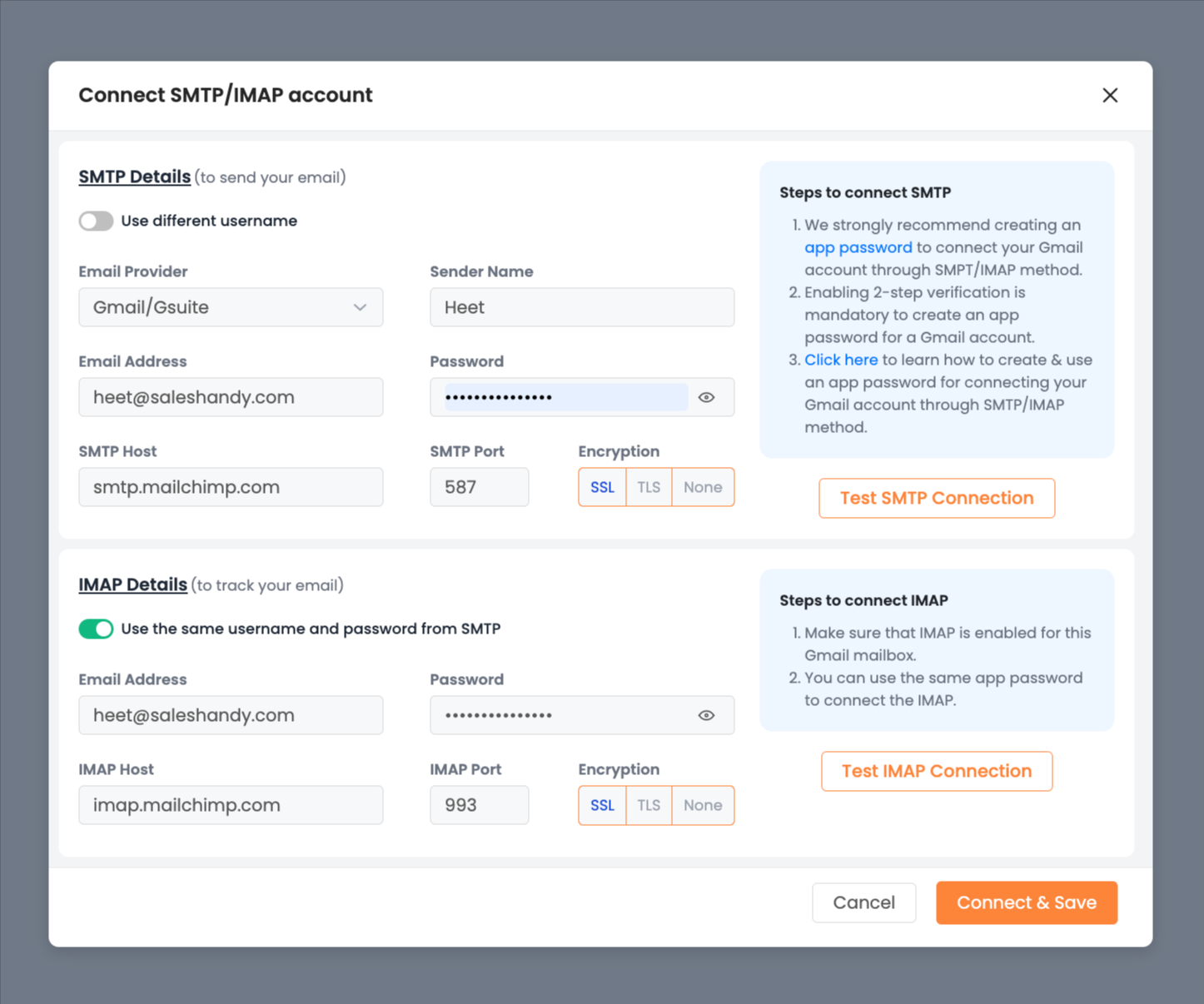 Enter the following SMTP/IMAP settings for Mailchimp: