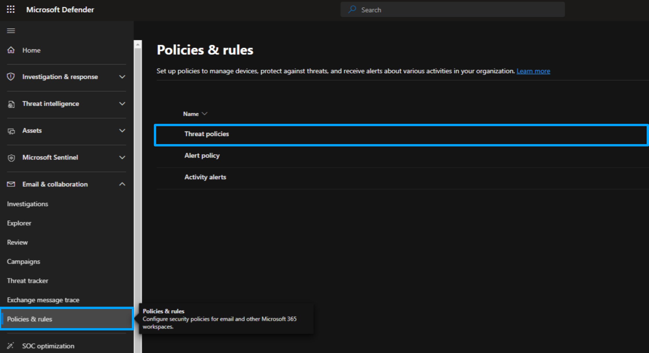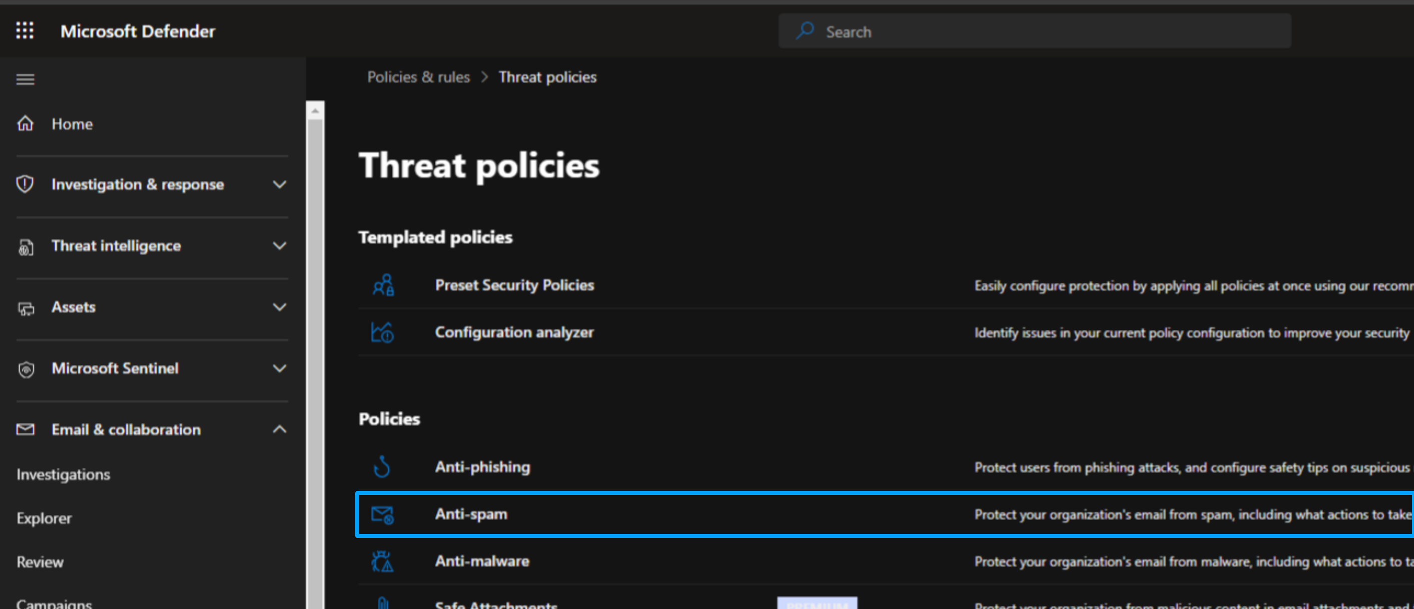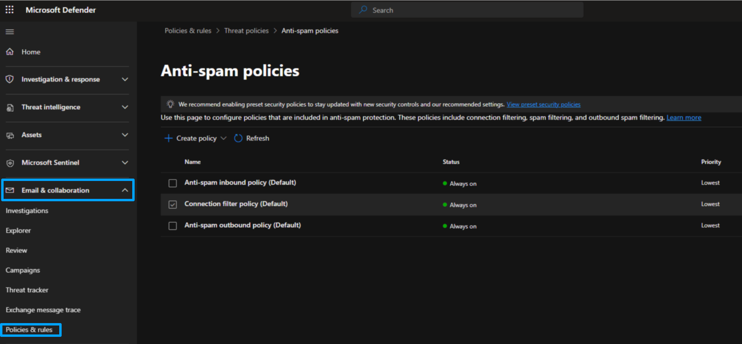 Then, go to Policies & Rules > Threat policies > Anti-spam policies.