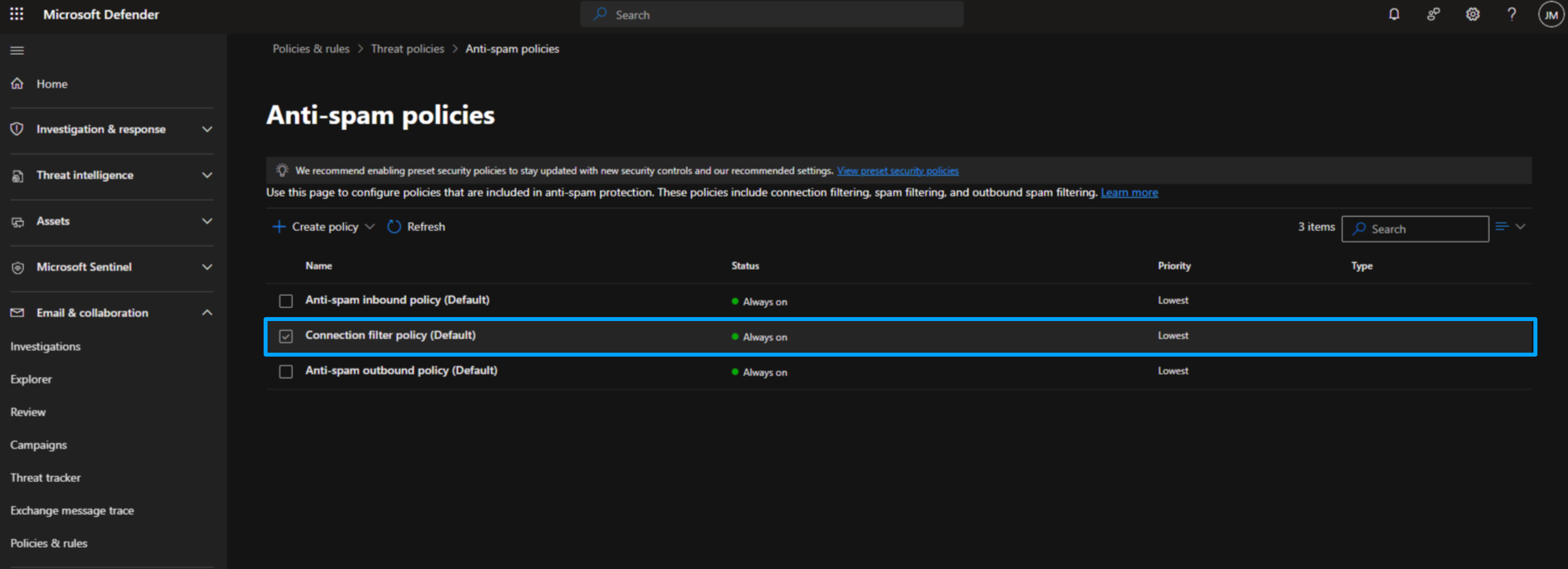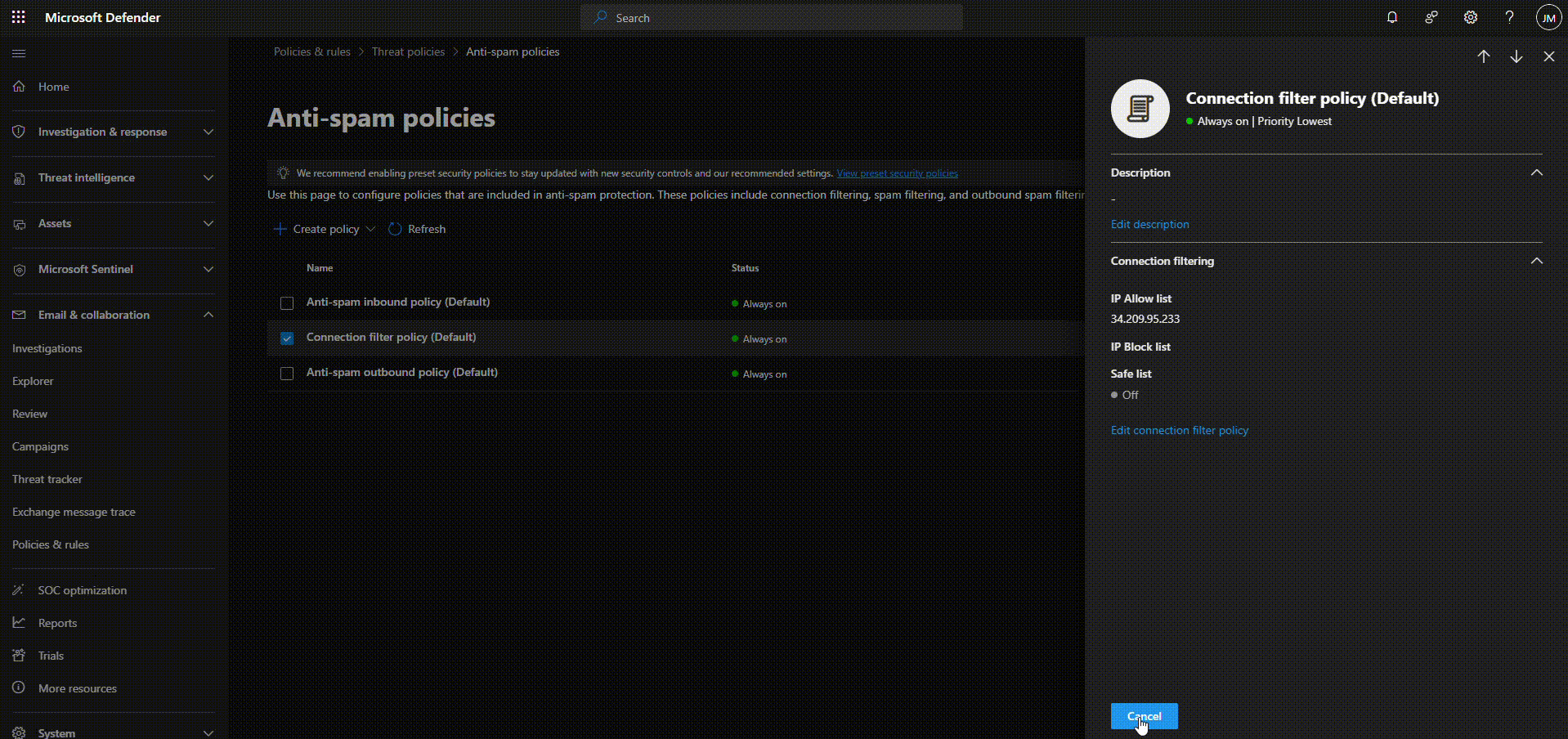 Look for the Connection filter policy in the Anti-spam policies section.